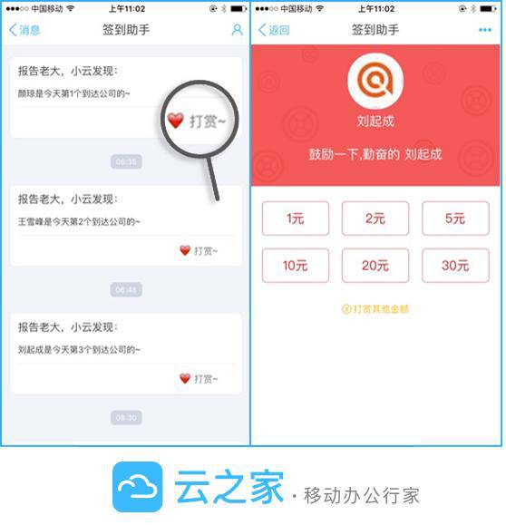 作为中国最专业的移动工作平台,云之家创新性地将红包功能融入到工作激励、公司活动、员工生日、考勤签到、工作汇报、商机线索提交等众多企业应用场景之中,管理者可以在这些场景中选择“打赏”功能,对员工进行红包激励。