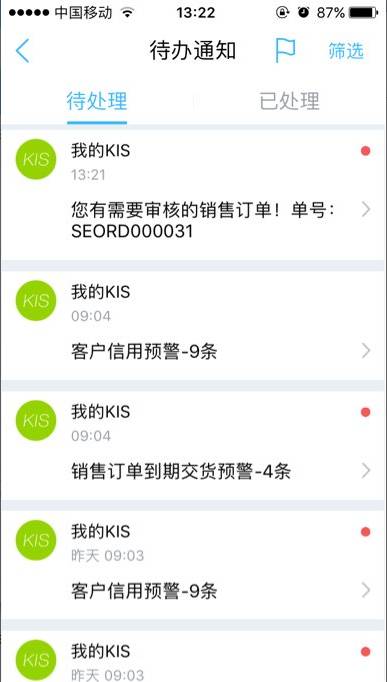 为有权限的用户提供云之家待办通知功能,只要使用KIS专业版及商贸版的移动应用销售下单、财务审批、销售审批、客户信用预警、销售订单交期预警,就会为有权限的制单人、审核人等提供云之家待办通知。第一次使用,需要先在云之家中先绑定账套。