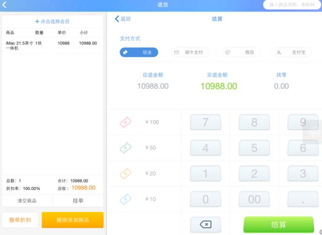 ✔支持现金、银行卡、微信、支付宝、apple pay等多种主流收银方式,并支持自定义收银(抵扣券、充值卡、积分兑换);